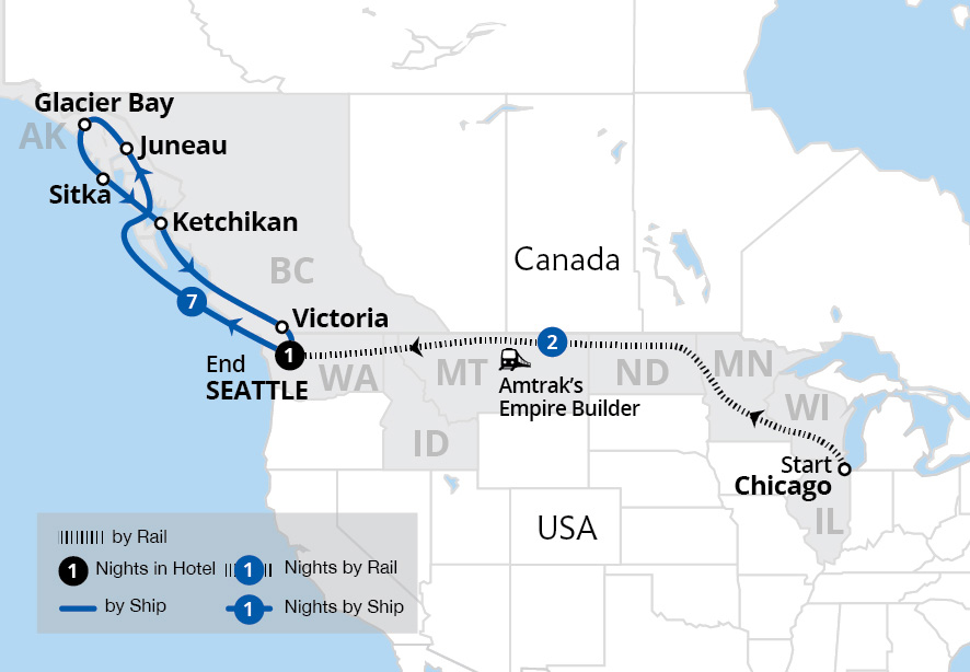 Passage to ports of call like Ketchikan, Sitka, Glacier Bay