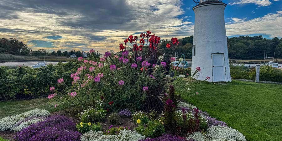 The gardens of the Nonantum Resort, one of the properties our tours stop at, are an incredible place to watch boats and birds pass by the little lighthouse.