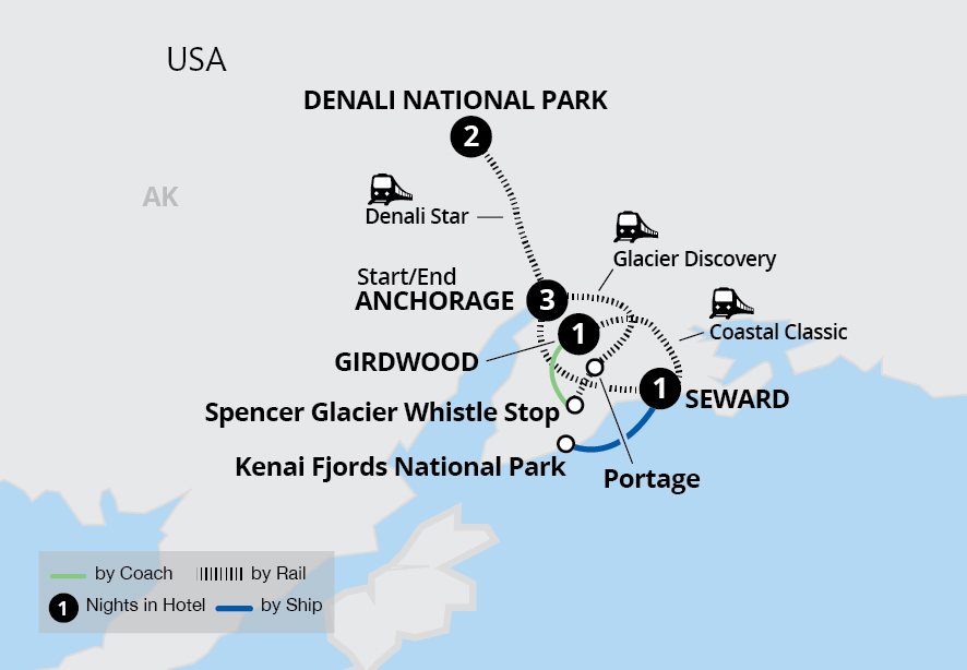 Embark on an 11-day tour featuring some of Alaska's most revered railroads. Discover the natural beauty of Prince William Sound during a cruise and travel aboard the Glacier Discovery train from Whittier to Anchorage, before marveling at scenic Turnagain Arm as the Coastal Classic takes you to Kenai Fjords National Park and Seward. Ride the...