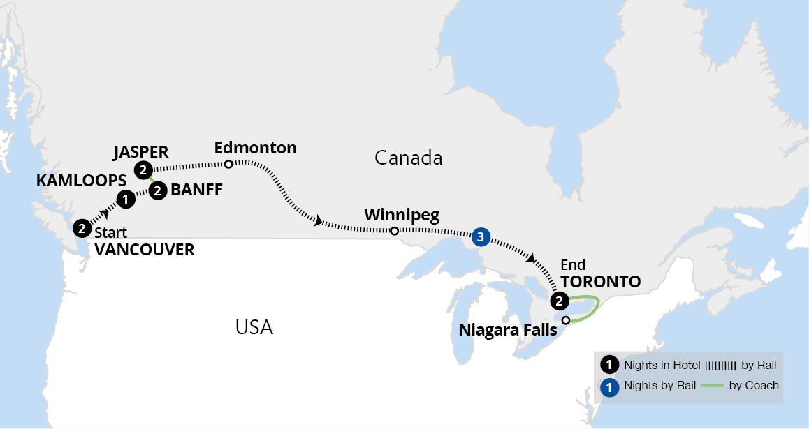 Uncover Canada's most amazing landscapes on this journey from the Pacific Coast to the Great Lakes. Our exploration begins with a guided tour of Vancouver before touring the stunning Rocky Mountains from the mountain town of Jasper. Here, we admire awe-inspiring vistas, including the Maligne River Valley. An epic three-night journey from...