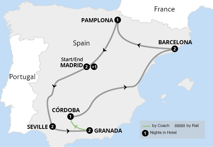Continuing through Spain, we spend time in Córdoba and venture through Barcelona's streets to view La Sagrada Familia and the Gothic Quarter. Heading north into the Basque Country to the town of Pamplona, we are introduced to timeless scenery and ancient traditions before returning to Madrid.
