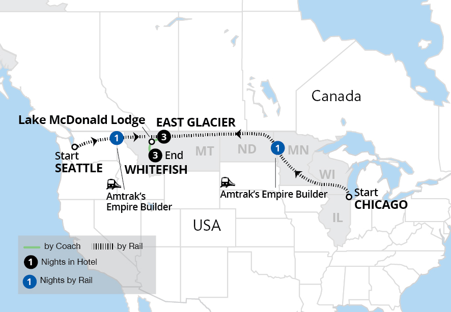 Should travelers wish to depart from Seattle or points in between, they may do so and meet the Tour Manager and group upon arrival in Glacier National Park. Overnight train.
