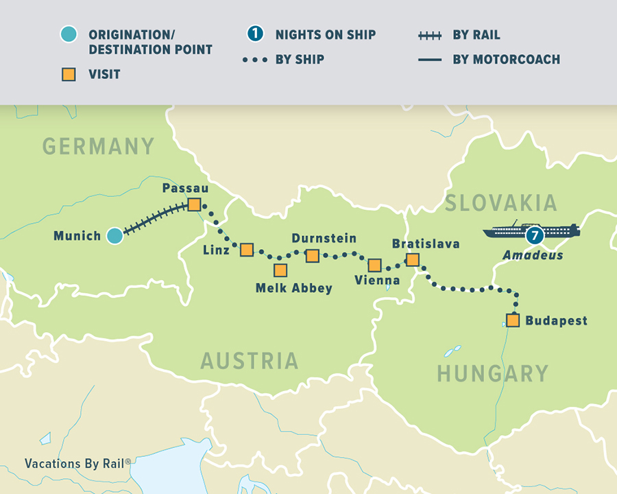 Sail from the German border town of Passau through the Austrian wine-growing region of the Wachau Valley, admiring picturesque Dürnstein and commanding Melk Abbey enroute. After exploring imperial Vienna, the captivating Hungarian capital of Budapest and the Baroque Old Town of Bratislava, the cruise concludes in vibrant Linz.