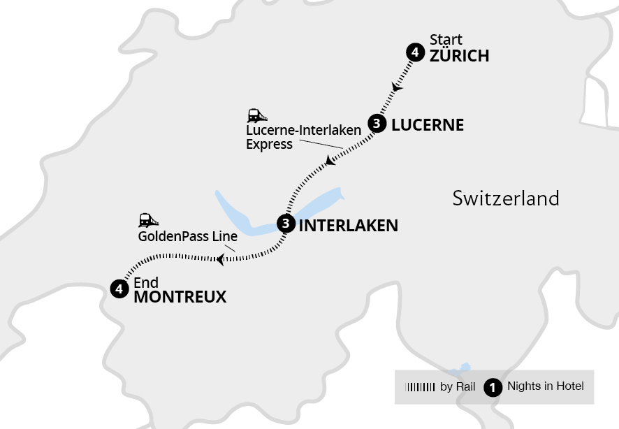 From Switzerland's largest city, Zürich, this round-trip unveils an unforgettable perspective on this small but stunning European country. Uncover delightful towns such as medieval St Gallen and Lucerne, lakeside Montreux, upmarket St Moritz and charming Zermatt, traveling between them on Switzerland's famed trains. Renowned railroads provide a...