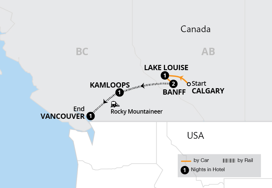 The majesty of the Canadian Rockies awaits on this round-trip tour through western Canada. Begin in the coastal city of Vancouver before you board the first train of your tour, Rocky Mountaineer, early the next morning for the journey to Kamloops. After an overnight, take in more Rocky Mountain scenery on the way to the famed resort town of Banff,...