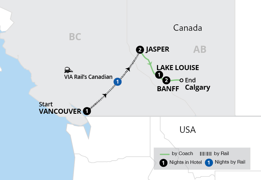 The majesty of the Canadian Rockies awaits on this round-trip tour through western Canada. Begin in the coastal city of Vancouver before you board the first train of your tour, Rocky Mountaineer, early the next morning for the journey to Kamloops. After an overnight, take in more Rocky Mountain scenery on the way to the famed resort town of...